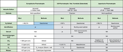 Für das Pharmagas Phargalis 1 gelten die beiden Monographien des EU-Arzneibuchs (2005) 5.0/1247 für die Herstellung und 5.0/1685 für die Aufbewahrung von Fertigarzneimitteln, die auf Sauerstoff besonders empfindlich reagieren. Bei diesen Monographien für Stickstoff (Nitrogenium) werden die Stickstoff-Gehaltsbestimmungen (N2 > 99,5%) und die Analysen der zu überprüfenden Grenzwerte bei Sauerstoff (O2), Kohlenmonoxid (CO), Kohlendioxid (CO2) und Feuchte (H2O) beschrieben (s. Tab.).