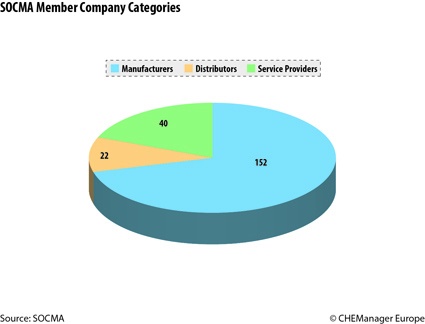 The Society of Chemical Manufacturers and Affiliates (SOCMA) has welcomed one of its largest groups of new members in more than two years in the first quarter of 2012. Ten companies, representing chemical manufacturers, distributors/suppliers and industry service providers were approved by SOCMA's Board of Governors in April. SOCMA has now a global membership of more than 210 companies, about 70 % of which are international chemical manufacturers.
